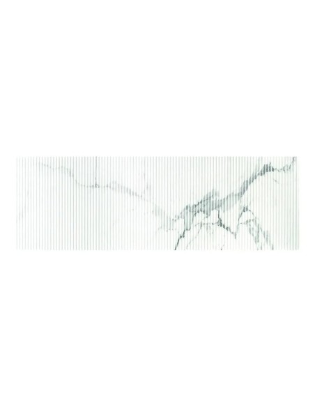 Είναι ένα κεραμικό πλακάκι επένδυσης τοίχου με λευκή επιφάνεια, γκρι ραβδώσεις, γυαλιστερό φινίρισμα και κάθετες αυλακώσεις που το κάνουν μοναδικό. Λόγω της υφής μαρμάρου είναι εξαιρετικά κομψό από μόνο του και χάρη στη γυαλιστερή του επιφάνεια φαίνεται ακόμα πιο πολυτελές.