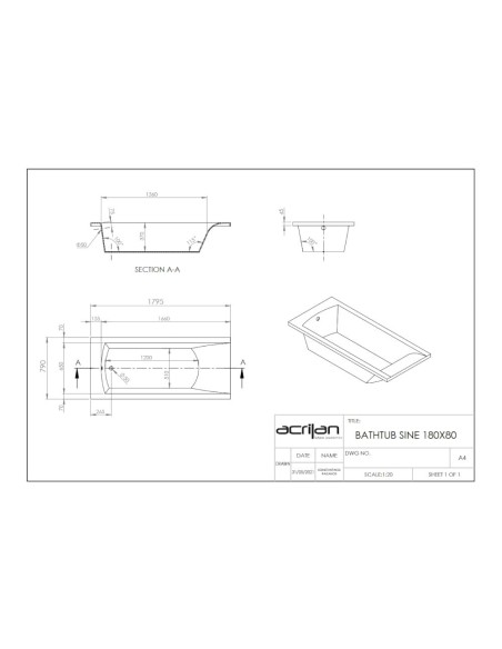 Μπανιέρα Sine με υδρομασάζ της εταιρείας Acrilan, διάστασης 180x80cm. Η τοποθέτησή της είναι ένθετη και αποτελεί τον συνηθέστερο τύπο μπανιέρας. Η εγκατάσταση της γίνεται κατά κύριο από τοίχο σε τοίχο.